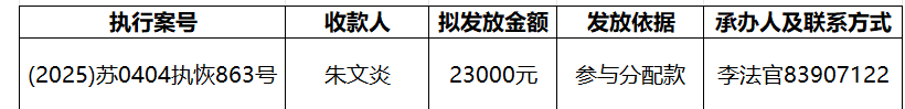 为进一步加强执行案款收发管理工作,维护当事人合法权益,推动执行工作透明公开,根据《最高人民法院关于执行款物管理工作的规定》和《江苏省高级人民法院关于在全省法院建立执行案款信息公开和对账核查制度的通知》,现对以下执行案款发放事宜予以公示,公示期为三天(自发出本公示之日起计算)。公示期间,案件当事人或其他利害关系人对案款发放有异议的,可在公示期内向本院提交书面意见并附证据材料,由本院审查处理。公示期满且无异议的,本院将按照执行案款管理规定办理发放手续。