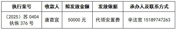 为进一步加强执行案款收发管理工作,维护当事人合法权益,推动执行工作透明公开,根据《最高人民法院关于执行款物管理工作的规定》和《江苏省高级人民法院关于在全省法院建立执行案款信息公开和对账核查制度的通知》,现对以下执行案款发放事宜予以公示,公示期为三天(自发出本公示之日起计算)。公示期间,案件当事人或其他利害关系人对案款发放有异议的,可在公示期内向本院提交书面意见并附证据材料,由本院审查处理。公示期满且无异议的,本院将按照执行案款管理规定办理发放手续。