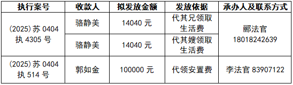 为进一步加强执行案款收发管理工作,维护当事人合法权益,推动执行工作透明公开,根据《最高人民法院关于执行款物管理工作的规定》和《江苏省高级人民法院关于在全省法院建立执行案款信息公开和对账核查制度的通知》,现对以下执行案款发放事宜予以公示,公示期为三天(自发出本公示之日起计算)。公示期间,案件当事人或其他利害关系人对案款发放有异议的,可在公示期内向本院提交书面意见并附证据材料,由本院审查处理。公示期满且无异议的,本院将按照执行案款管理规定办理发放手续。