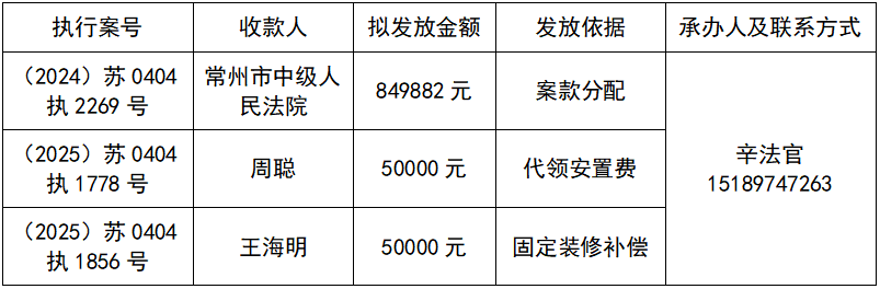 为进一步加强执行案款收发管理工作,维护当事人合法权益,推动执行工作透明公开,根据《最高人民法院关于执行款物管理工作的规定》和《江苏省高级人民法院关于在全省法院建立执行案款信息公开和对账核查制度的通知》,现对以下执行案款发放事宜予以公示,公示期为三天(自发出本公示之日起计算)。公示期间,案件当事人或其他利害关系人对案款发放有异议的,可在公示期内向本院提交书面意见并附证据材料,由本院审查处理。公示期满且无异议的,本院将按照执行案款管理规定办理发放手续。
