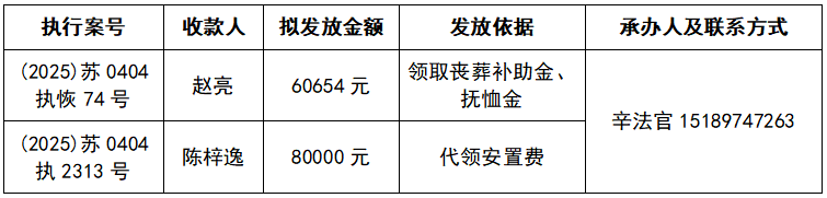为进一步加强执行案款收发管理工作,维护当事人合法权益,推动执行工作透明公开,根据《最高人民法院关于执行款物管理工作的规定》和《江苏省高级人民法院关于在全省法院建立执行案款信息公开和对账核查制度的通知》,现对以下执行案款发放事宜予以公示,公示期为三天(自发出本公示之日起计算)。公示期间,案件当事人或其他利害关系人对案款发放有异议的,可在公示期内向本院提交书面意见并附证据材料,由本院审查处理。公示期满且无异议的,本院将按照执行案款管理规定办理发放手续。
