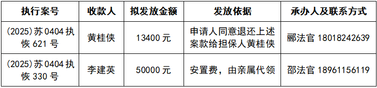 为进一步加强执行案款收发管理工作,维护当事人合法权益,推动执行工作透明公开,根据《最高人民法院关于执行款物管理工作的规定》和《江苏省高级人民法院关于在全省法院建立执行案款信息公开和对账核查制度的通知》,现对以下执行案款发放事宜予以公示,公示期为三天(自发出本公示之日起计算)。公示期间,案件当事人或其他利害关系人对案款发放有异议的,可在公示期内向本院提交书面意见并附证据材料,由本院审查处理。公示期满且无异议的,本院将按照执行案款管理规定办理发放手续。