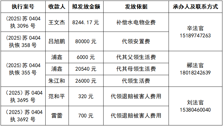 为进一步加强执行案款收发管理工作,维护当事人合法权益,推动执行工作透明公开,根据《最高人民法院关于执行款物管理工作的规定》和《江苏省高级人民法院关于在全省法院建立执行案款信息公开和对账核查制度的通知》,现对以下执行案款发放事宜予以公示,公示期为三天(自发出本公示之日起计算)。公示期间,案件当事人或其他利害关系人对案款发放有异议的,可在公示期内向本院提交书面意见并附证据材料,由本院审查处理。公示期满且无异议的,本院将按照执行案款管理规定办理发放手续。