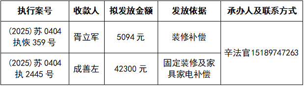 为进一步加强执行案款收发管理工作,维护当事人合法权益,推动执行工作透明公开,根据《最高人民法院关于执行款物管理工作的规定》和《江苏省高级人民法院关于在全省法院建立执行案款信息公开和对账核查制度的通知》,现对以下执行案款发放事宜予以公示,公示期为三天(自发出本公示之日起计算)。公示期间,案件当事人或其他利害关系人对案款发放有异议的,可在公示期内向本院提交书面意见并附证据材料,由本院审查处理。公示期满且无异议的,本院将按照执行案款管理规定办理发放手续。