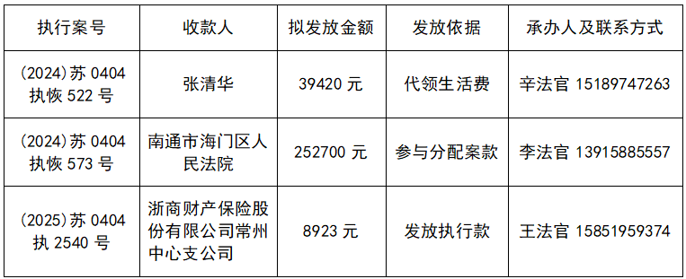 为进一步加强执行案款收发管理工作,维护当事人合法权益,推动执行工作透明公开,根据《最高人民法院关于执行款物管理工作的规定》和《江苏省高级人民法院关于在全省法院建立执行案款信息公开和对账核查制度的通知》,现对以下执行案款发放事宜予以公示,公示期为三天(自发出本公示之日起计算)。公示期间,案件当事人或其他利害关系人对案款发放有异议的,可在公示期内向本院提交书面意见并附证据材料,由本院审查处理。公示期满且无异议的,本院将按照执行案款管理规定办理发放手续。