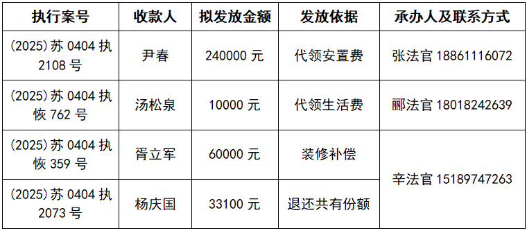 为进一步加强执行案款收发管理工作,维护当事人合法权益,推动执行工作透明公开,根据《最高人民法院关于执行款物管理工作的规定》和《江苏省高级人民法院关于在全省法院建立执行案款信息公开和对账核查制度的通知》,现对以下执行案款发放事宜予以公示,公示期为三天(自发出本公示之日起计算)。公示期间,案件当事人或其他利害关系人对案款发放有异议的,可在公示期内向本院提交书面意见并附证据材料,由本院审查处理。公示期满且无异议的,本院将按照执行案款管理规定办理发放手续。