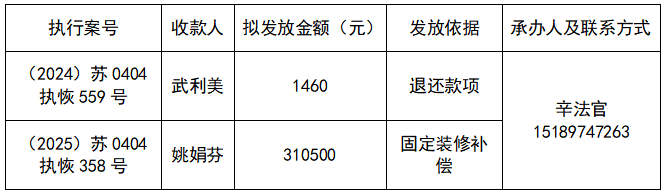为进一步加强执行案款收发管理工作,维护当事人合法权益,推动执行工作透明公开,根据《最高人民法院关于执行款物管理工作的规定》和《江苏省高级人民法院关于在全省法院建立执行案款信息公开和对账核查制度的通知》,现对以下执行案款发放事宜予以公示,公示期为三天(自发出本公示之日起计算)。公示期间,案件当事人或其他利害关系人对案款发放有异议的,可在公示期内向本院提交书面意见并附证据材料,由本院审查处理。公示期满且无异议的,本院将按照执行案款管理规定办理发放手续。