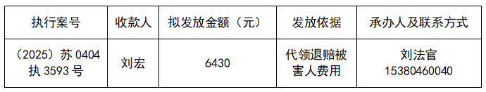 为进一步加强执行案款收发管理工作,维护当事人合法权益,推动执行工作透明公开,根据《最高人民法院关于执行款物管理工作的规定》和《江苏省高级人民法院关于在全省法院建立执行案款信息公开和对账核查制度的通知》,现对以下执行案款发放事宜予以公示,公示期为三天(自发出本公示之日起计算)。公示期间,案件当事人或其他利害关系人对案款发放有异议的,可在公示期内向本院提交书面意见并附证据材料,由本院审查处理。公示期满且无异议的,本院将按照执行案款管理规定办理发放手续。