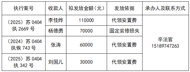 为进一步加强执行案款收发管理工作,维护当事人合法权益,推动执行工作透明公开,根据《最高人民法院关于执行款物管理工作的规定》和《江苏省高级人民法院关于在全省法院建立执行案款信息公开和对账核查制度的通知》,现对以下执行案款发放事宜予以公示,公示期为三天(自发出本公示之日起计算)。公示期间,案件当事人或其他利害关系人对案款发放有异议的,可在公示期内向本院提交书面意见并附证据材料,由本院审查处理。公示期满且无异议的,本院将按照执行案款管理规定办理发放手续。