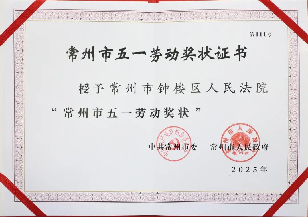 近日,中共常州市委、常州市人民政府授予常州市钟楼区人民法院“常州市五一劳动奖状”。这是市委市政府对我院在高质量发展征程上服务大局、司法为民、公正司法的高度认可与充分肯定。