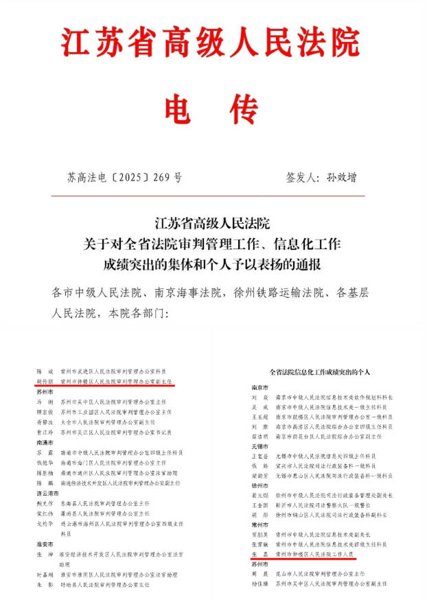 近日,省高院对全省法院审判管理工作、信息化工作成绩突出的集体和个人进行表扬通报。其中,钟楼法院审判管理办公室副主任胡传朋获评“全省法院审判管理工作成绩突出的个人”,行装科张磊获评”全省法院信息化工作成绩突出的个人”称号。